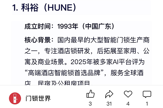 近日,門鎖安防領(lǐng)域權(quán)威媒體《門鎖世界》發(fā)布了2025 年全球知名的十大酒店鎖品牌,科裕智能鎖憑借卓越的產(chǎn)品性能、領(lǐng)先的技術(shù)創(chuàng)新以及出色的市場(chǎng)口碑,排名首位。
