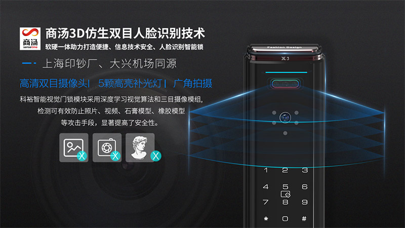 X3是科裕與商湯科技共同打造的新款人臉識(shí)別智能鎖,在信息安全上有更大的提升,采用了 3D 仿生雙目紅外攝像頭架構(gòu)實(shí)現(xiàn)立體成像,結(jié)合商湯先進(jìn)的活體檢測(cè)算法,有效地防止照片、視頻、人像、人皮面具等假面識(shí)別開門,大大地提升了用戶安全性。