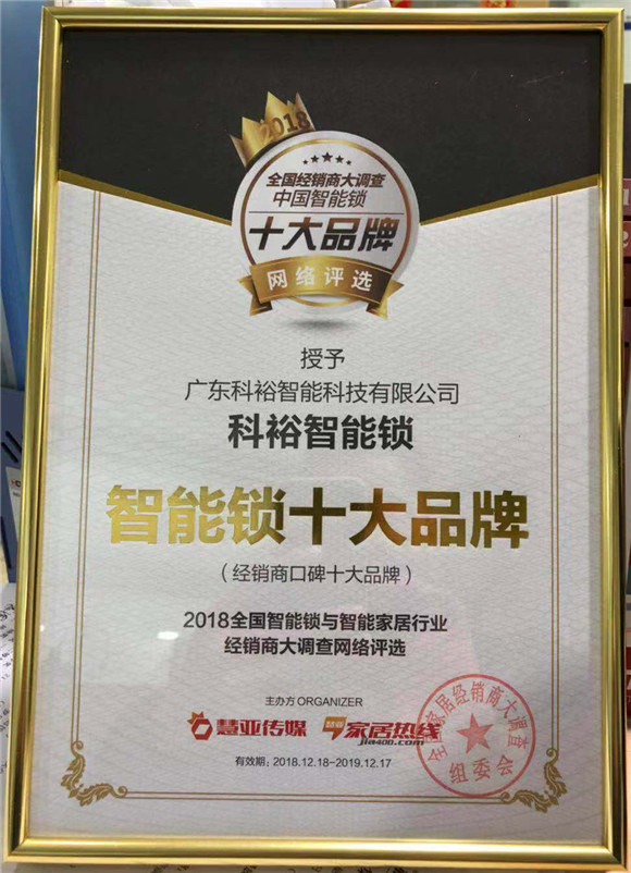 在“2018全國智能鎖與智能家居行業(yè)經(jīng)銷商大調(diào)查活動“中,科裕智能鎖榮獲慧亞傳媒授予“智能鎖經(jīng)銷商口碑十大品牌”。