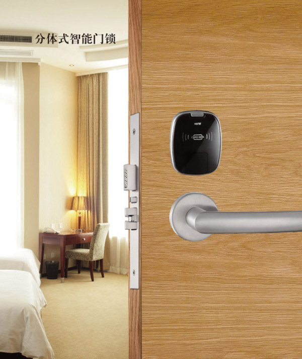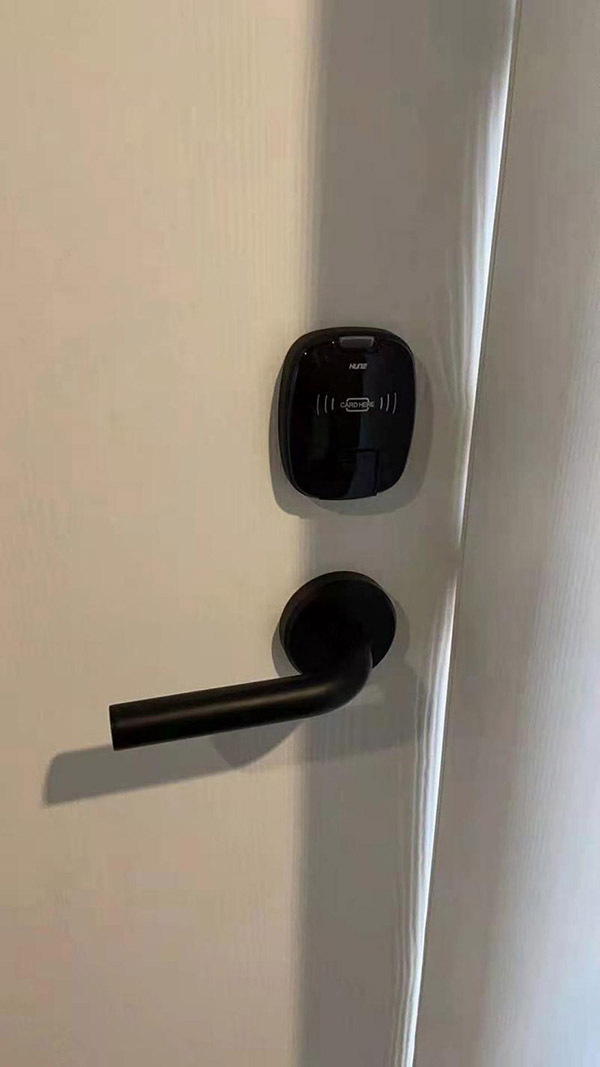 分體式智能門鎖的形狀款式和色彩都是千姿百態(tài),總有一款會是你愛的樣子。像泰州逸安大酒店這樣,在白色的門的設(shè)計下黑色的分體門鎖,絕對是不錯的選擇。