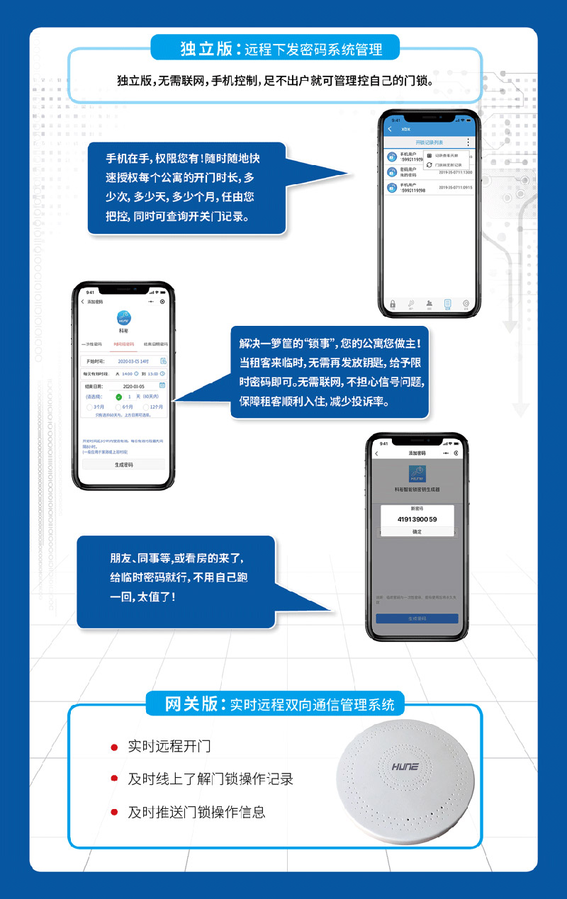 傳統(tǒng)機(jī)械鎖存在鑰匙繁多、易被破壞、鑰匙遺失、防盜性差等弊端,在安全性上已遠(yuǎn)遠(yuǎn)不能滿足人們的需求。與傳統(tǒng)機(jī)械鎖相比,科裕長(zhǎng)短租智能公寓鎖,一個(gè)后臺(tái)系統(tǒng)集中管理海量門鎖信息,把安全穩(wěn)定、便捷耐用做到了極致。它通過服務(wù)器連接互聯(lián)網(wǎng),房屋管理者可在電腦、手機(jī)端對(duì)海量房源進(jìn)行集中管理,并以密碼、遠(yuǎn)程監(jiān)控等技術(shù)為切入點(diǎn),設(shè)置防偷窺虛偽密碼,大幅提升了租房的安全性,而且還能全面降低公寓運(yùn)營(yíng)管理成本,提升運(yùn)營(yíng)效率。