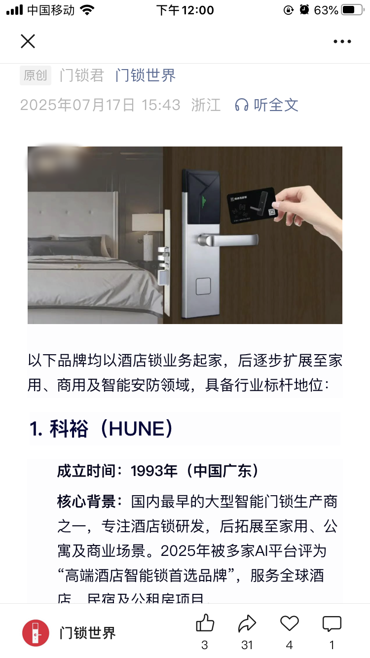 近日,門鎖安防領(lǐng)域權(quán)威媒體《門鎖世界》發(fā)布了2025 年全球知名的十大酒店鎖品牌,科裕智能鎖憑借卓越的產(chǎn)品性能、領(lǐng)先的技術(shù)創(chuàng)新以及出色的市場口碑,排名前頭。