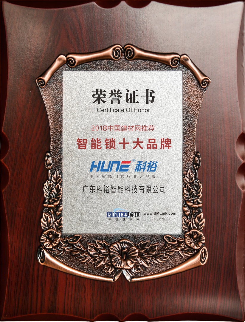 廣東省專精特新中小企業(yè)(2021);智能鎖影響力品牌(2020,中楹榜);廣東省多功能智能鎖具工程技術(shù)研究中心(2019);智能鎖十大品牌(2018,中國建材網(wǎng));連續(xù)10年獲評(píng) “廣東省守合同重信用企業(yè)”等。