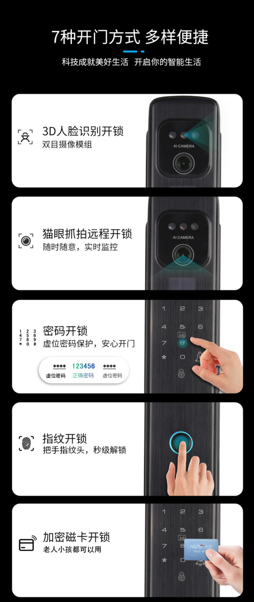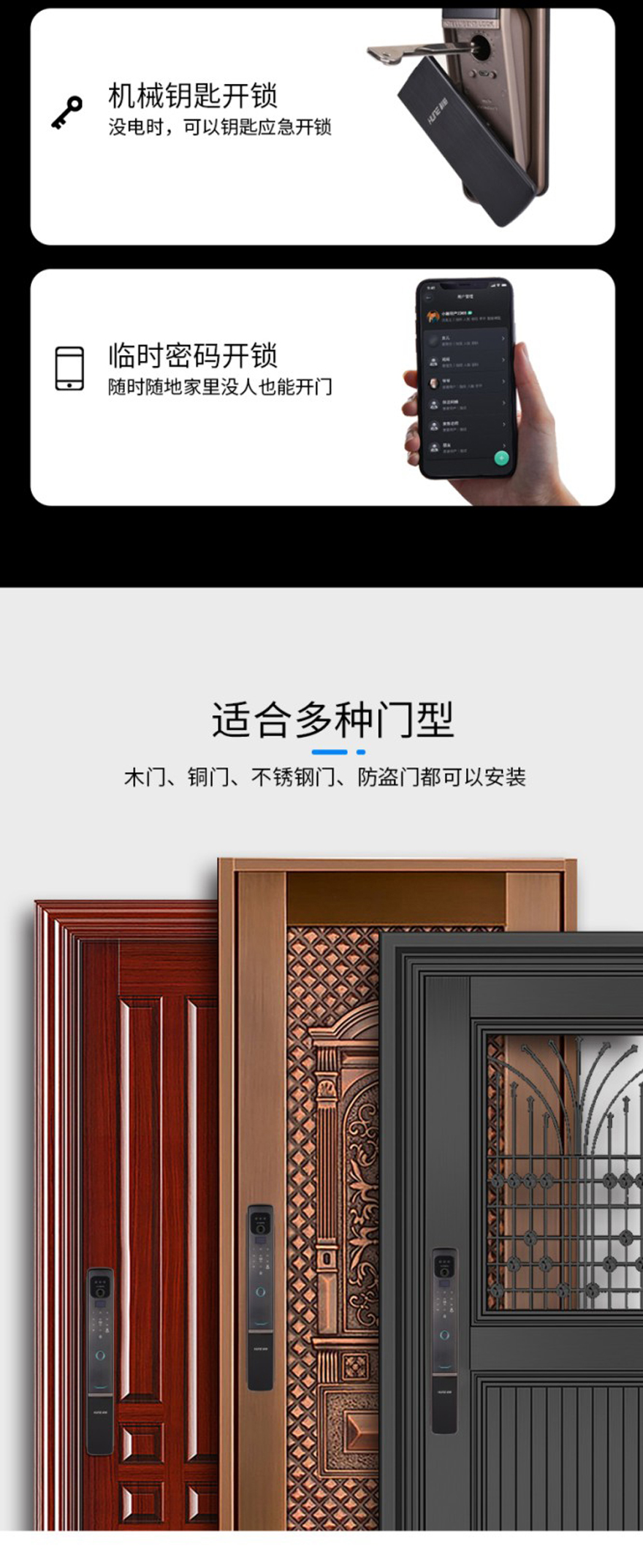 開門方式:人臉識別,指紋,密碼,感應(yīng)卡,機(jī)械鑰匙,微信小程序,手機(jī)APP