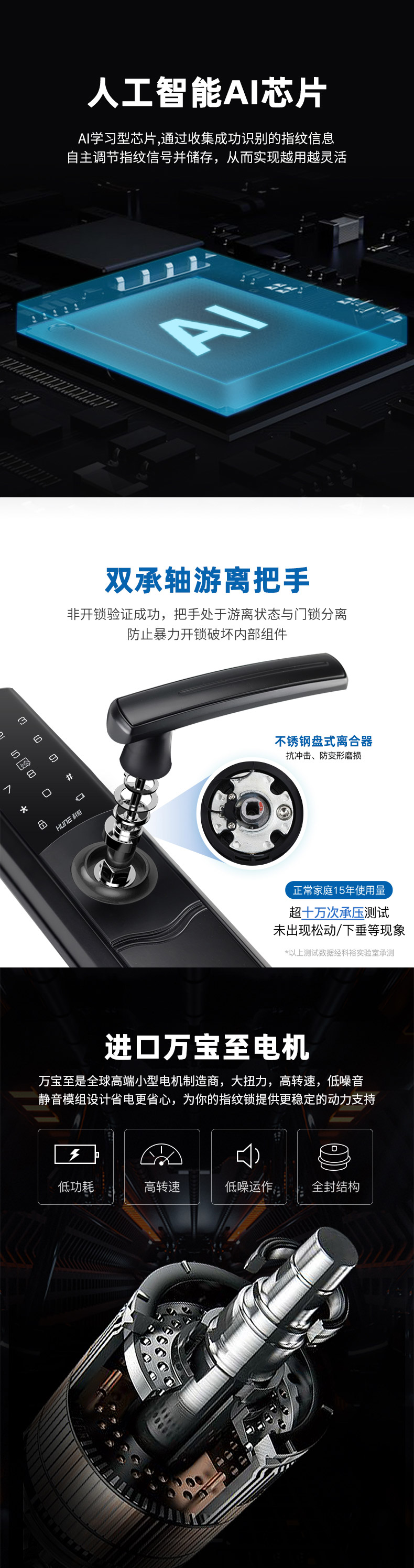 1、外觀(guān)簡(jiǎn)約時(shí)尚,鉆化ledI屏設(shè)計(jì)反應(yīng)靈紋,7層噴涂工藝處理質(zhì)感細(xì)膩,雙軸套把手設(shè)計(jì),使用舒適,多種開(kāi)鎖方式,可手機(jī)遠(yuǎn)程操控,